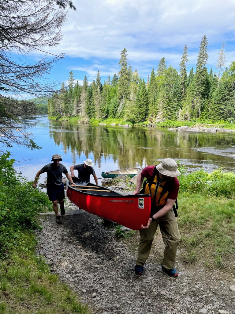 The portage for Allagash Falls came early the following day. We changed into trail runners, hoisted heavy loads on our backs and shoulders, and traveled by foot to the other side of the falls. After flowing with the river, this mode of transportation felt woefully inefficient. Still, many hands made (relatively) light work, and we portaged it all in just two trips. We rewarded ourselves with a long swim below the falls before pushing off again.