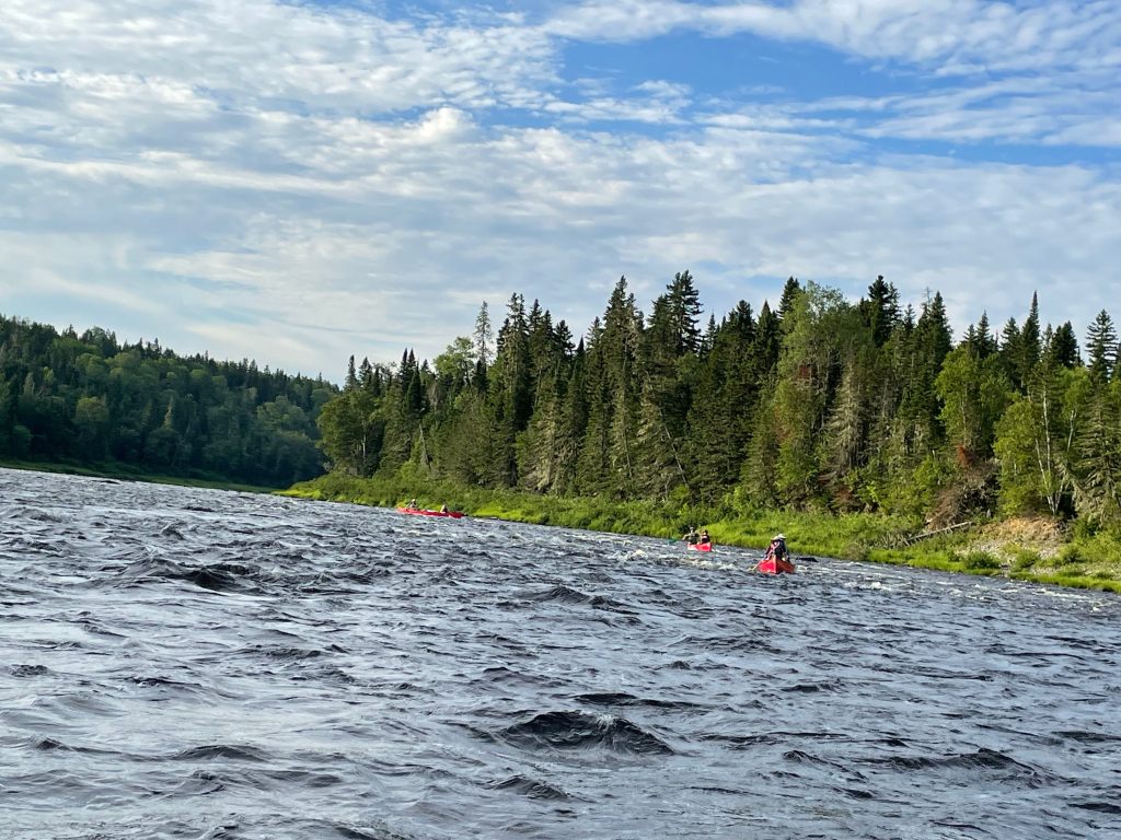 The midsummer sun stretched long arms down the river as we packed our canoes the next morning. We set off with renewed energy. Bald eagles, great blue herons, kingfishers, and mergansers became our constant companions. We slipped silently by as deer crossed the river ahead of us. Paddlers at the stern became more adept at making minor course corrections, and those in the bow improved their forward stroke. Beyond technique, there’s an intuitive nature to paddling that we were beginning to understand. And just as we started to feel the rhythm, we entered the first of many rips (easy rapids).