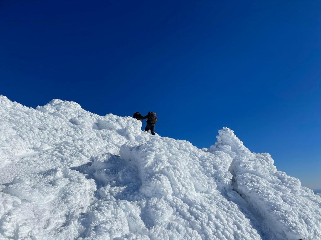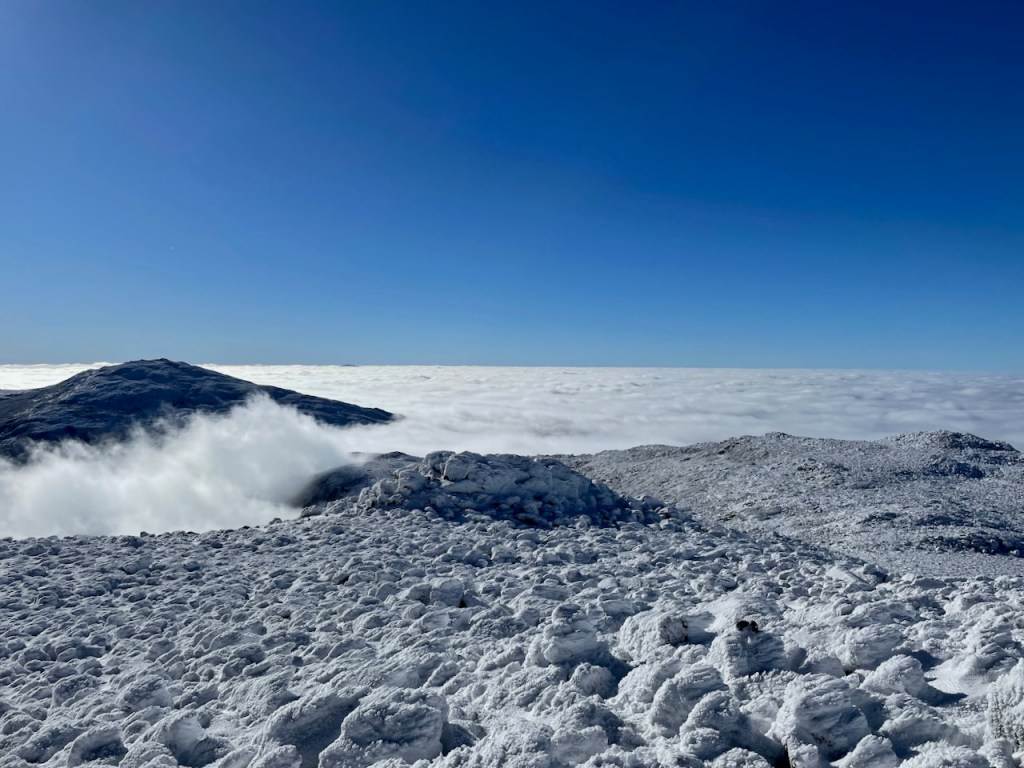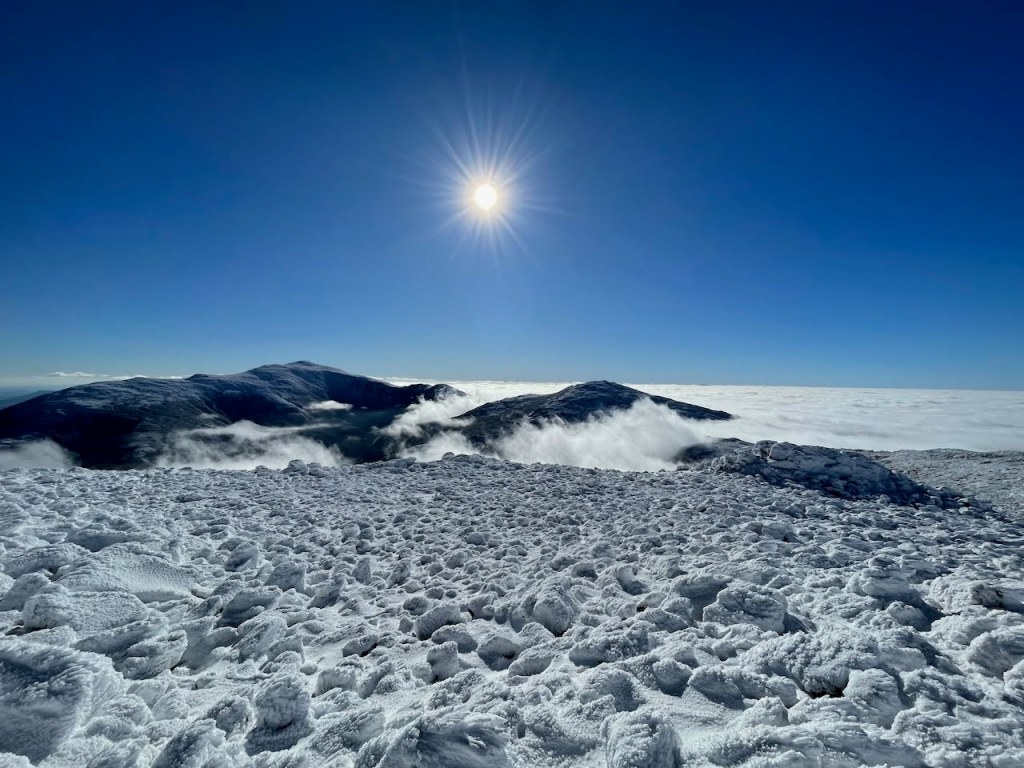It’s a rare and memorable experience to hike above treeline on a windless, blue-bird day and look down on a bank of clouds. But the show we had on Sunday was beyond compare. Soon after reaching Thunderstorm Junction, as we started to ascend Mount Adams on Lowe’s Path, the undercast transformed into ocean. Crashing waves heaved over Edmunds and Sphinx Cols, spilling into the Jefferson Ravine and the Great Gulf. I stared with stunned awe at the scene and then tried to capture it. These photos can’t begin to do justice to the moment.